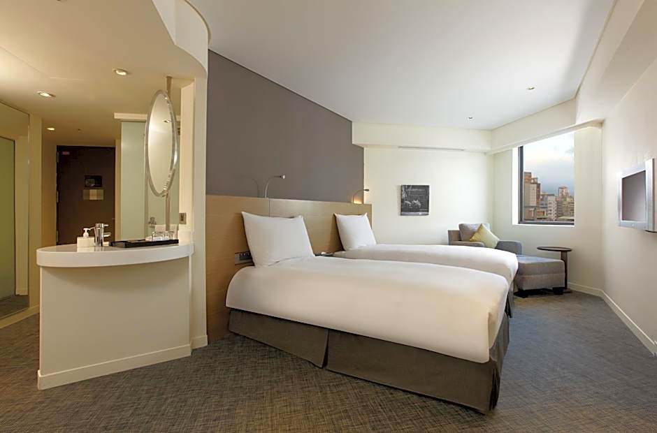 Featuring 2 single beds, carpeted floor, premium bedding, large window with ample lighting, 26-inch LCD TV, cable channels, sofa, free bottle waters, coffee, tea, free laundry service, free WiFi, reading lights, free toiletries.